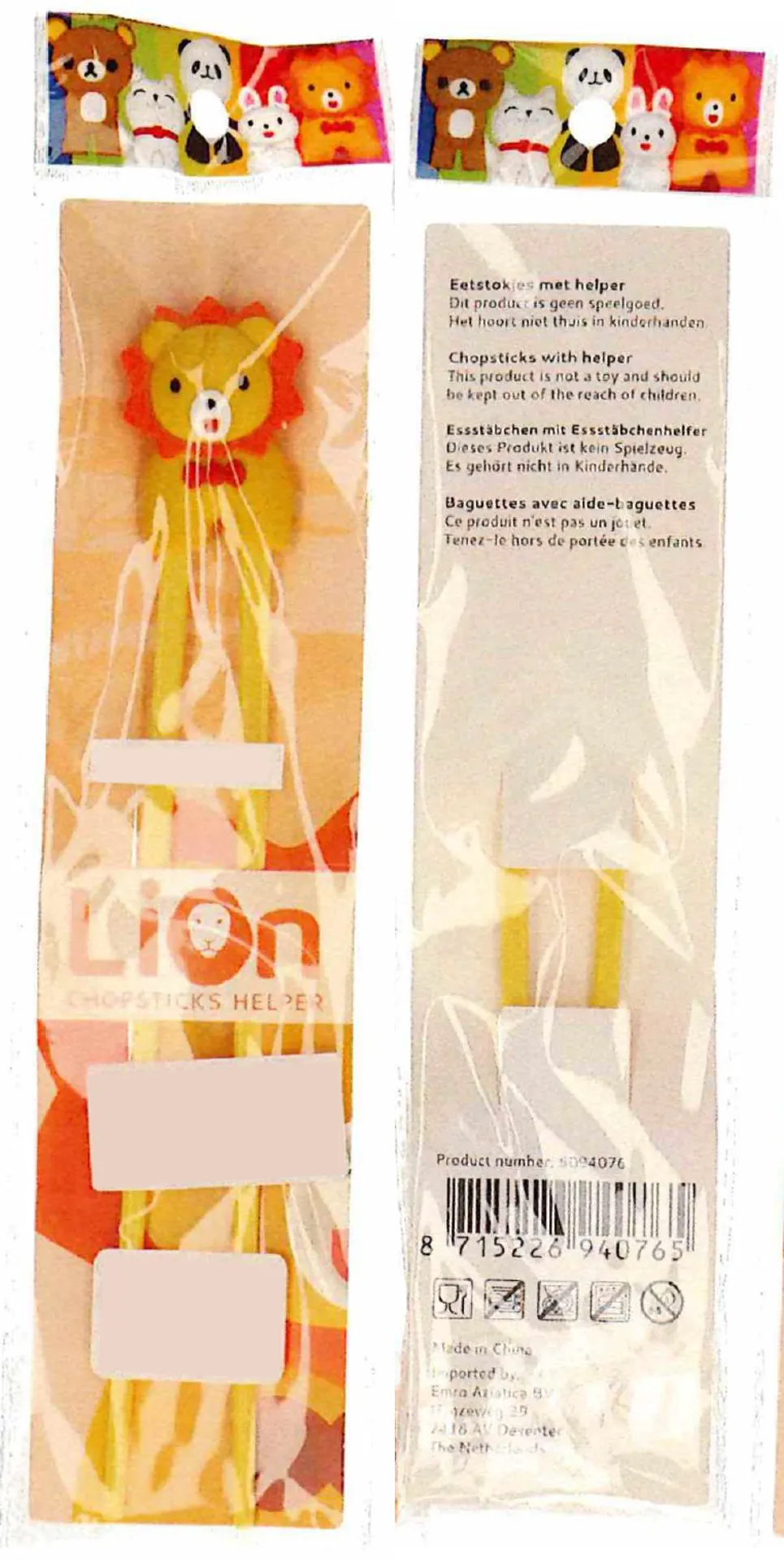 Chargennummer / Los-Kennzeichnung: 6094071: Essstaebchen-Helfer Panda 6094072: Essstaebchen-Helfer Baer 6094073: Essstaebchen-Helfer Katze 6094074: Essstaebchen-Helfer Schwein 6094075: Essstaebchen-Helfer Hase 6094076: Essstaebchen-Helfer Loewe 6094077: Essstaebchen-Helfer Tiger 6094078: Essstaebchen-Helfer Maus